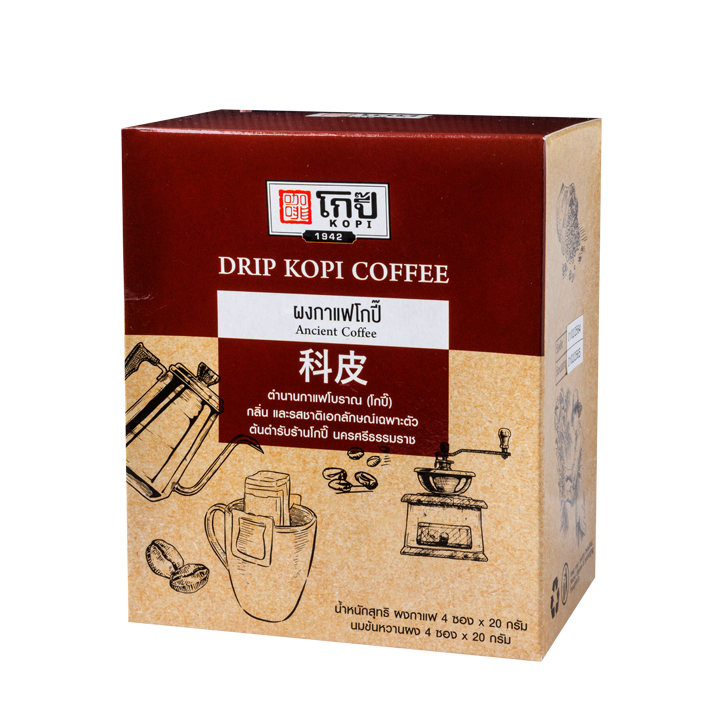 กาแฟ ดริป ขนาด 20 กรัม 1 กล่อง บรรจุ 4 ชุด ตรา โกปี๊ DRIP KOPI COFFEE ส่งตรง จาก นครศรีธรรมราช รับประกัน ของแท้ 100%